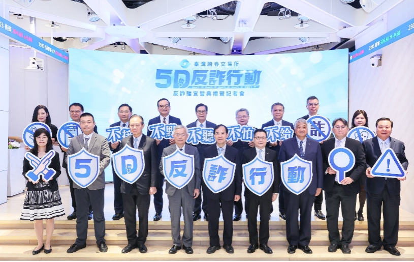 詐騙已是全民公敵,為凝聚各界力量、引領證券市場對抗投資詐騙,證交所舉辦反詐騙宣誓典禮。金管會證期局張振山局長、內政部警政署張榮興署長、刑事警察局周幼偉局長、行政院打詐指揮中心黃國師執行秘書、證券商公會陳俊宏理事長均蒞臨典禮,投信投顧公會劉宗聖理事長、投保中心張心悌董事長、券商公會經紀業務委員會詹正恩召集人及第一線服務投資人的各大證券經紀商代表也熱烈參與響應。
