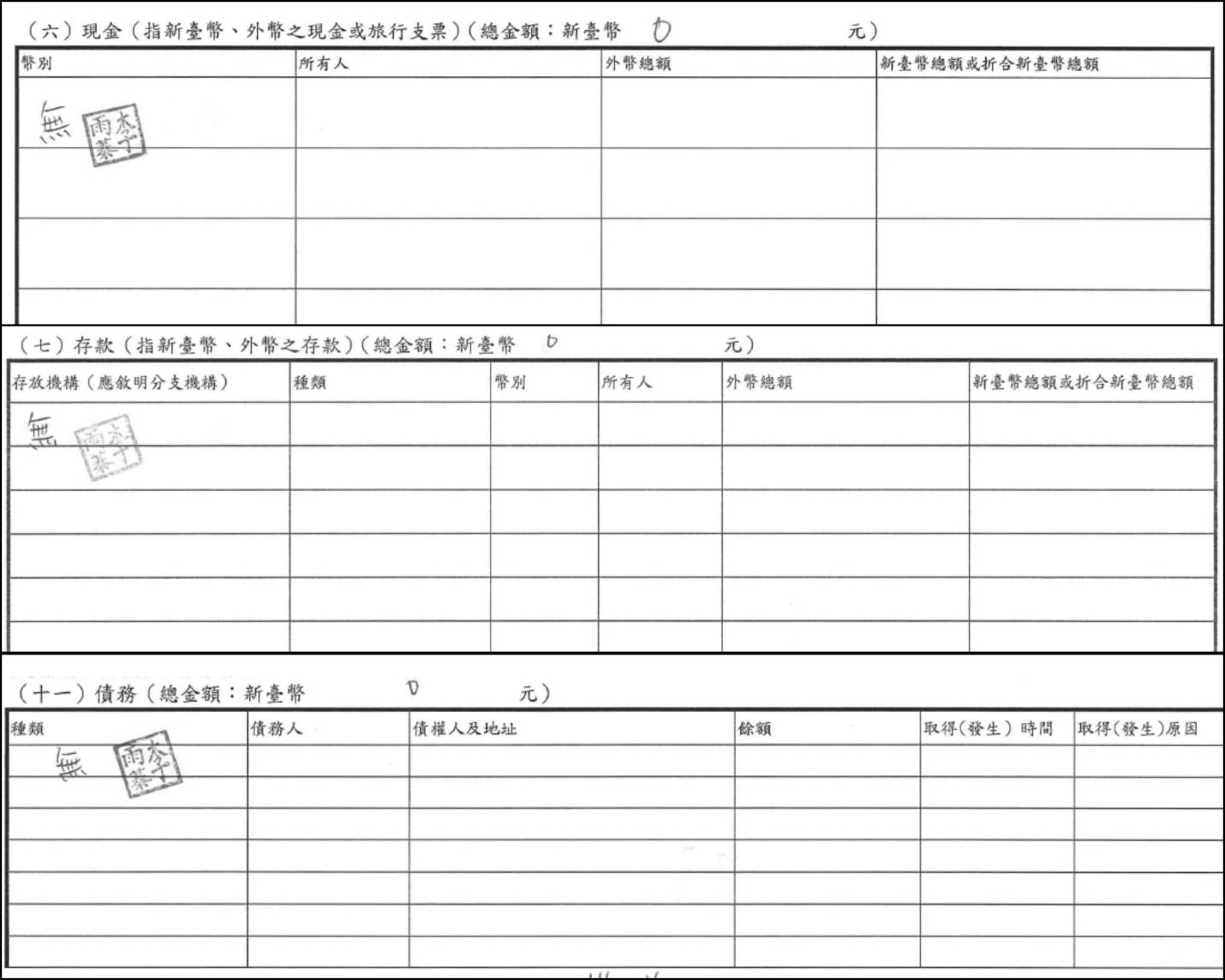 不動產 無、船舶 無, 汽車 無, 航空器 無 ,現金0元, 存款0元 ,有價證券0元, 股票0元 ,珠寶骨董 無, 債權 0 債務0元 事業投資 0元。