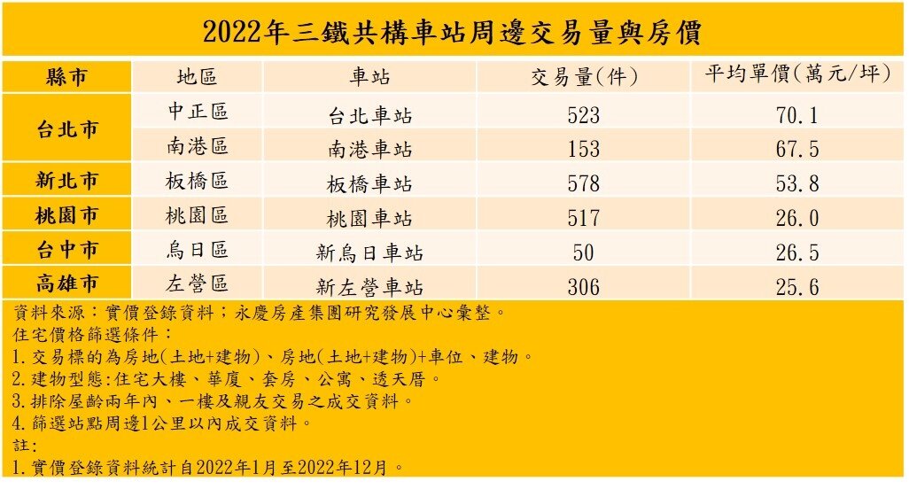 「軌道經濟」已經是目前房市的一門顯學,永慶房產集團根據實價登錄資料,彙總了全台六大三鐵共構車站的交易行情,並依照地區進行排序。其中,台北車站以平均單價70.1萬元為六大車站中最高,板橋車站則以交易量578件獲得冠軍,至於桃園與新左營車站則是CP值最高。