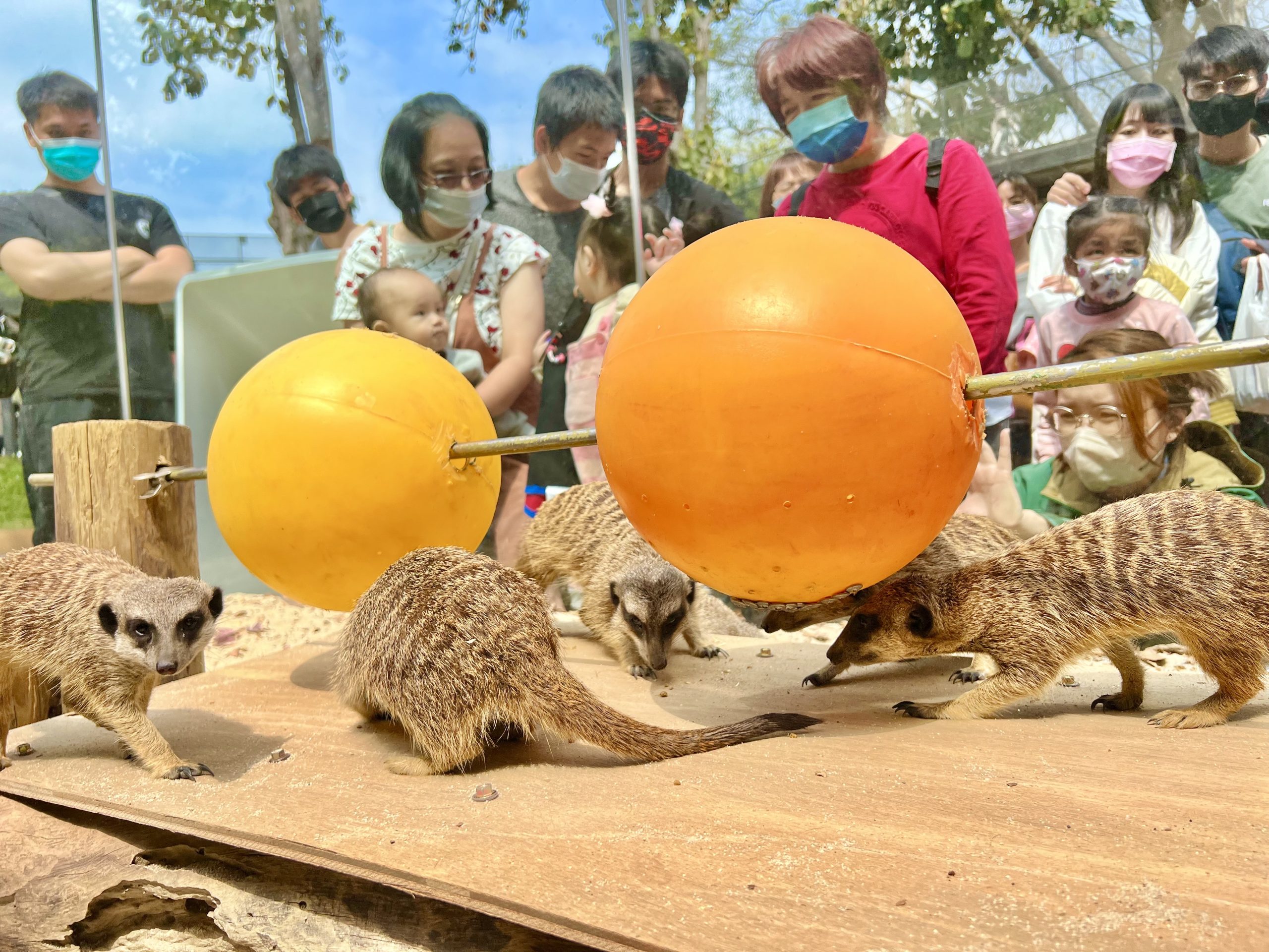 228連假期間,壽山動物園湧入近3萬8千人前往觀賞,不少眼尖民眾也發現,狐獴展場出現像串燒的圓球裝置,保育員一將狐獴最愛的麵包蟲放入戳有小孔的塑膠圓球中,聰明的狐獴便會利用長爪將圓球轉動到某個角度,讓蟲蟲從孔洞掉出得以盡情享用。