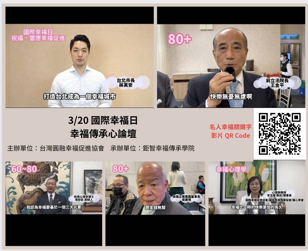 臺北市長蔣萬安、前立法院長王金平、哈佛心理學湯發鉅博士、臺北護理健康大學特聘教授李玉嬋、良機集團董事長張廣博等產官學界名人錄製幸福關鍵字短片,一同響應3/20國際幸福日幸福傳承心論壇,更多名人幸福關鍵字影片請掃QR Code。(圖/台灣圓融幸福促進協會)