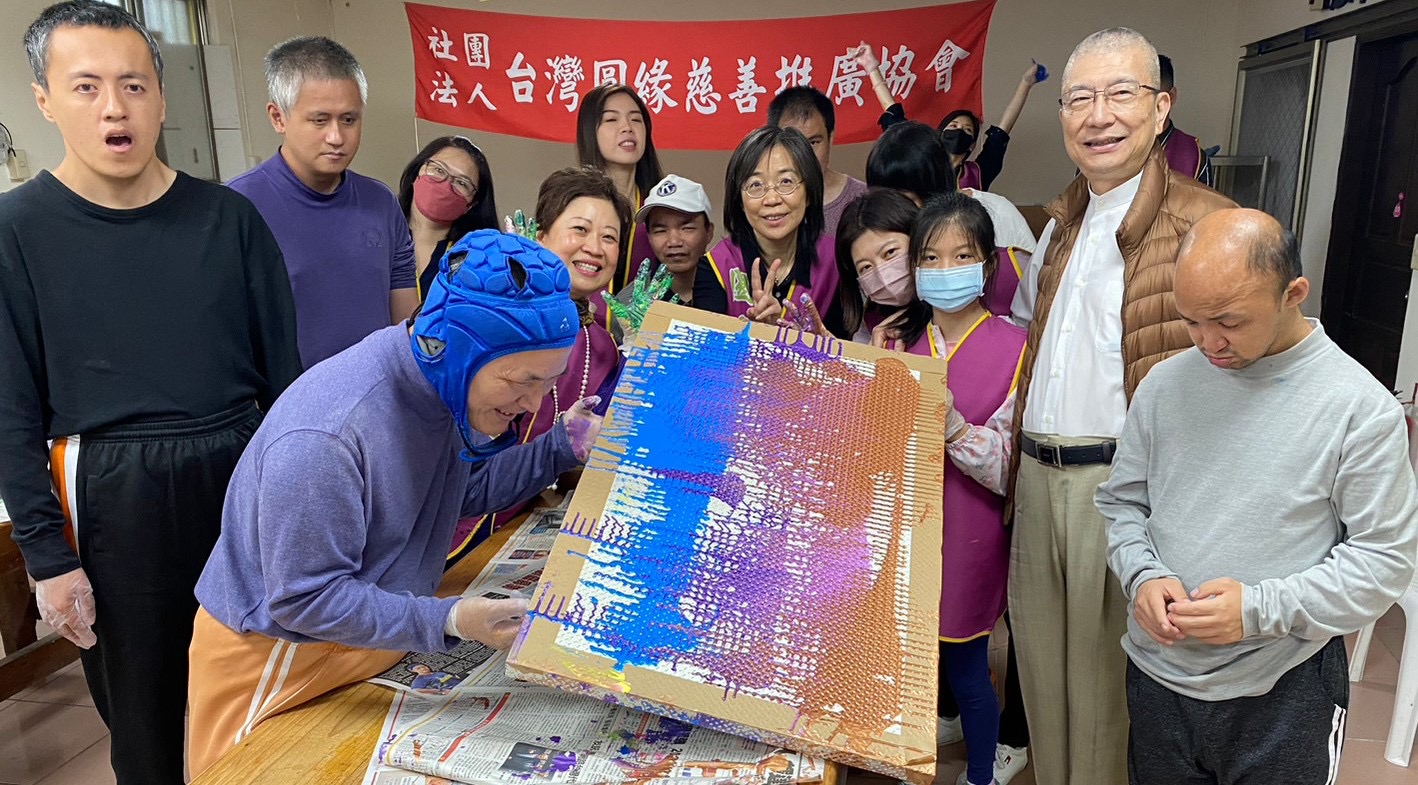台灣圓緣慈善推廣協會成立十年,積極行善,不僅長期捐助桃園地區教養院,更不定時安排志工活動身體力行陪伴老憨兒。昨日前往圓緣會長期認養的桃園市私立嘉惠啟智教養院,舉辦一日快閃畫室志工服務活動。受到圓緣會名譽顧問許翃銘董事長委託,希望在璨鋒陞企業公司消音天花板建材上讓老憨兒作畫。圓緣會湯發鉅創辦人、李玉嬋理事長、曹晏華創會理事長帶領志工們,嘗試全新的流動彩繪無筆創作,與身心障礙的老憨兒們一起在吸音板上揮灑彩墨。彩墨四濺、畫面繽紛,配著歡樂的笑聲,大家玩得不亦樂乎。圓緣會志工組合,有祖孫三代同行、母女檔、好友檔、青年軍,喚起許久不見的老憨兒們憶起圓緣會大哥哥姊姊們,也打開內心世界,心靈交流合作完成了一幅幅驚豔的畫作。他們不用畫筆,卻能盡情創作,用自己的方式表達內心所想。彼此都獲得心靈滋養與滿足。