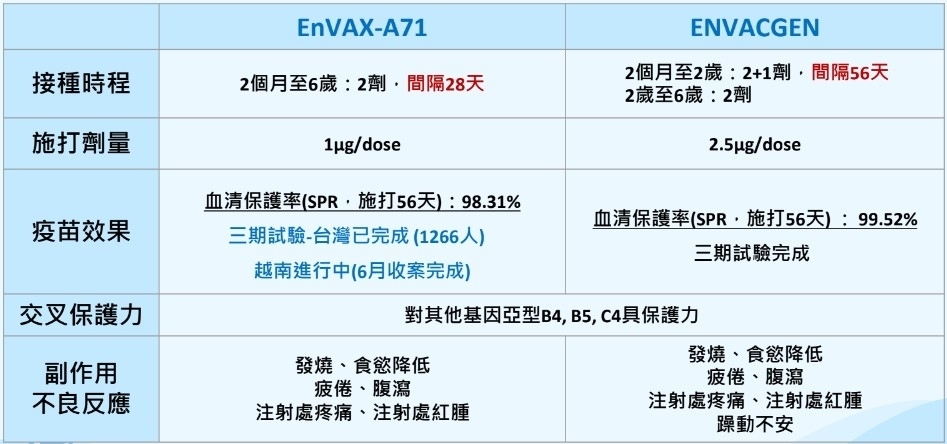 2款「腸病毒疫苗」接種時程、施打劑量、疫苗效果、保護力及副作用比較