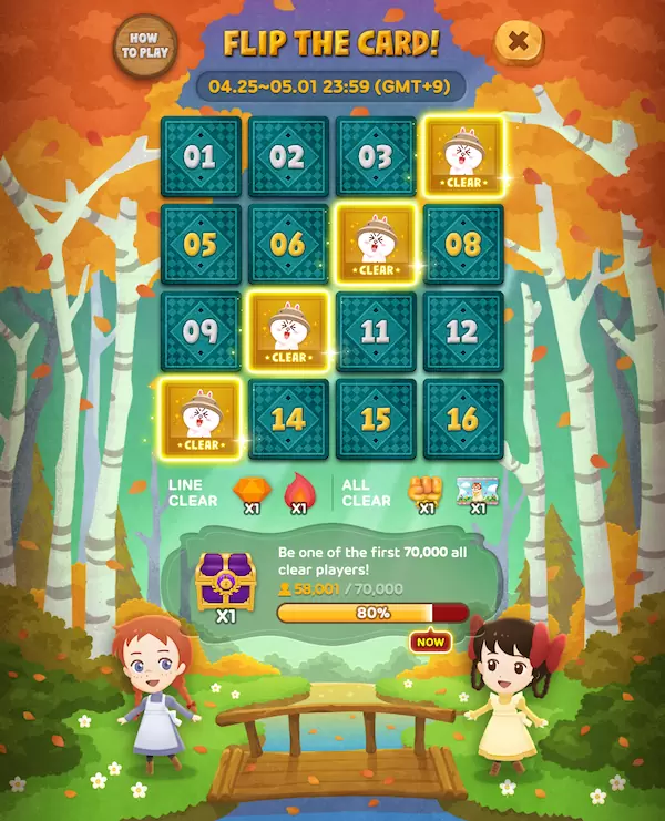 在活動期間內,以賓果遊戲方式,點選覆蓋的卡片進入活動關卡,把卡片全部翻開後即通關,通過所有關卡即可獲得獎勵!翻到幸運卡片時,也可以在過關後獲得幸運卡片獎勵。