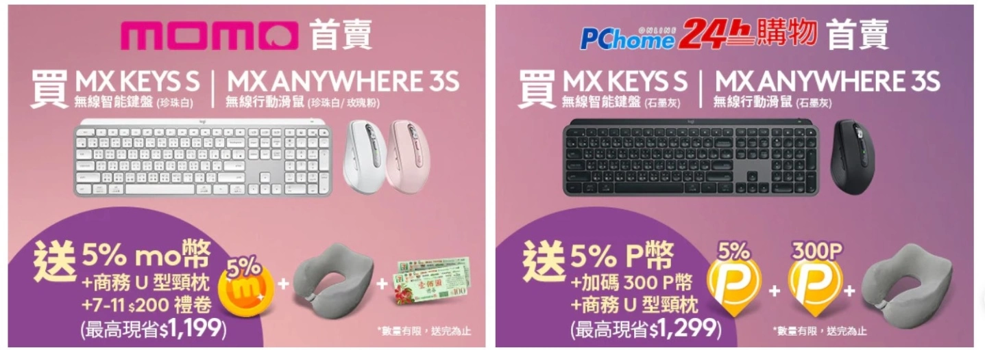 全新MX高階商務系列-MX Keys S 無線智能鍵盤及MX Anywhere 3S 無線行動滑鼠,預計 6 月 28 日全面上市,MX Keys S 無線智能鍵盤建議售價 3,990 元,MX Anywhere 3S 無線行動滑鼠建議售價 2,990 元。6 月 19 日 momo 、 PChome 全台搶先獨家首賣;momo 購物獨家首賣 MX Keys S 珍珠白與 MX Anywhere 3S 珍珠白和玫瑰粉,限量送商務 U 型頸枕乙個(價值799元)、5% mo幣以及 7-11 200 元 禮券乙張,最高限賺 1,199 元;PChome 獨家首賣石墨灰 MX Keys S 與 MX Anywhere 3S,限量送商務 U 型頸枕乙個(價值799元)、5% P幣以及再加碼 300 P幣,最高現賺 1,299 元。6 月 21 日全通路再推出 85 折超值優惠的 MX Keys S Combo 無線智能鍵盤滑鼠組合,組合內含智能升級 MX Keys S 搭配旗艦鼠王 MX Master 3S S 與 MX 舒適手托,建議售價 7,290 元。