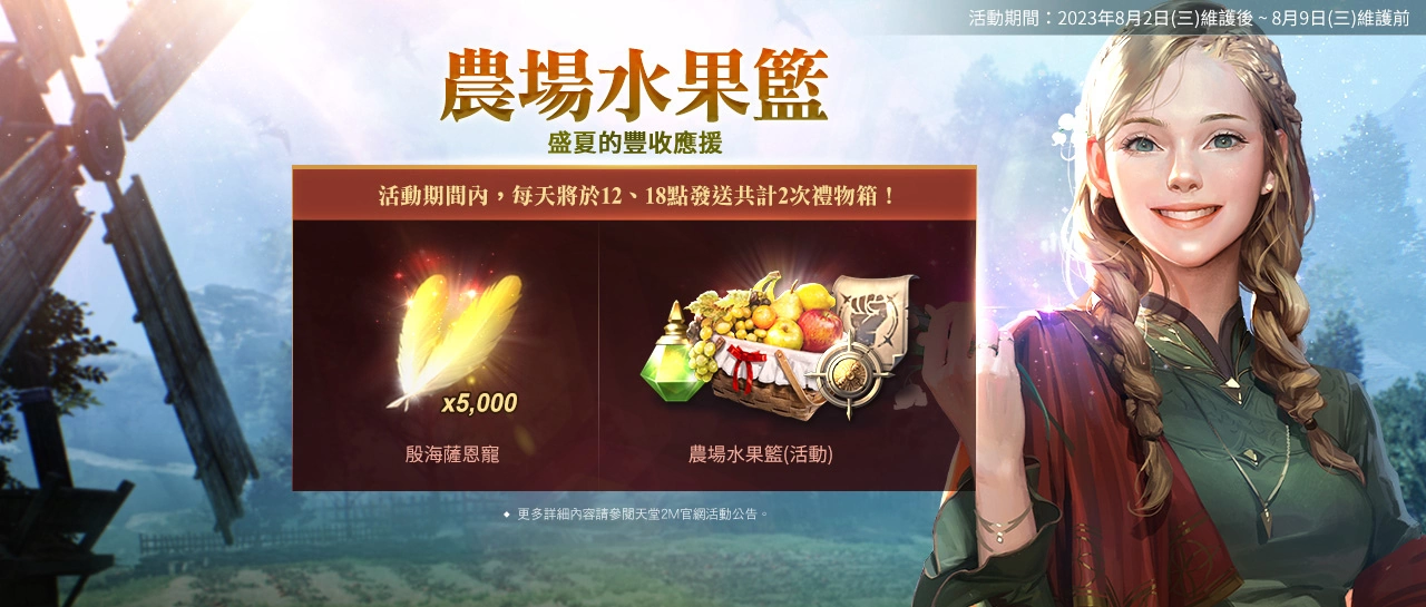 8 月 2 日維護後~8 月 9 日維護前,活動期間內每天將於 12 點、18 點發送共計 2 次禮物箱,可獲得包含「殷海薩恩寵×5,000、農場水果籃(活動)」等獎勵。