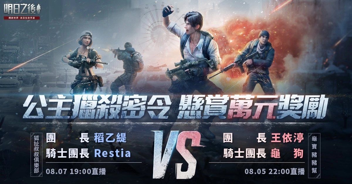 於此同時,公主獵殺密令也悄然浮出水面。『龜寶豬豬幫』、『狐扯叔叔俱樂部』將分別於 8 月 5 日及 8 月 7 日進行直播,挑戰《明日之後》全新版本。凡於直播時段內,成功與兩大兵團匹配出戰,或成功擊殺團長,即可獲得 MyCard 點數,每場直播中輸出最高的倖存者,還可獲得現金 1 萬元賞金。