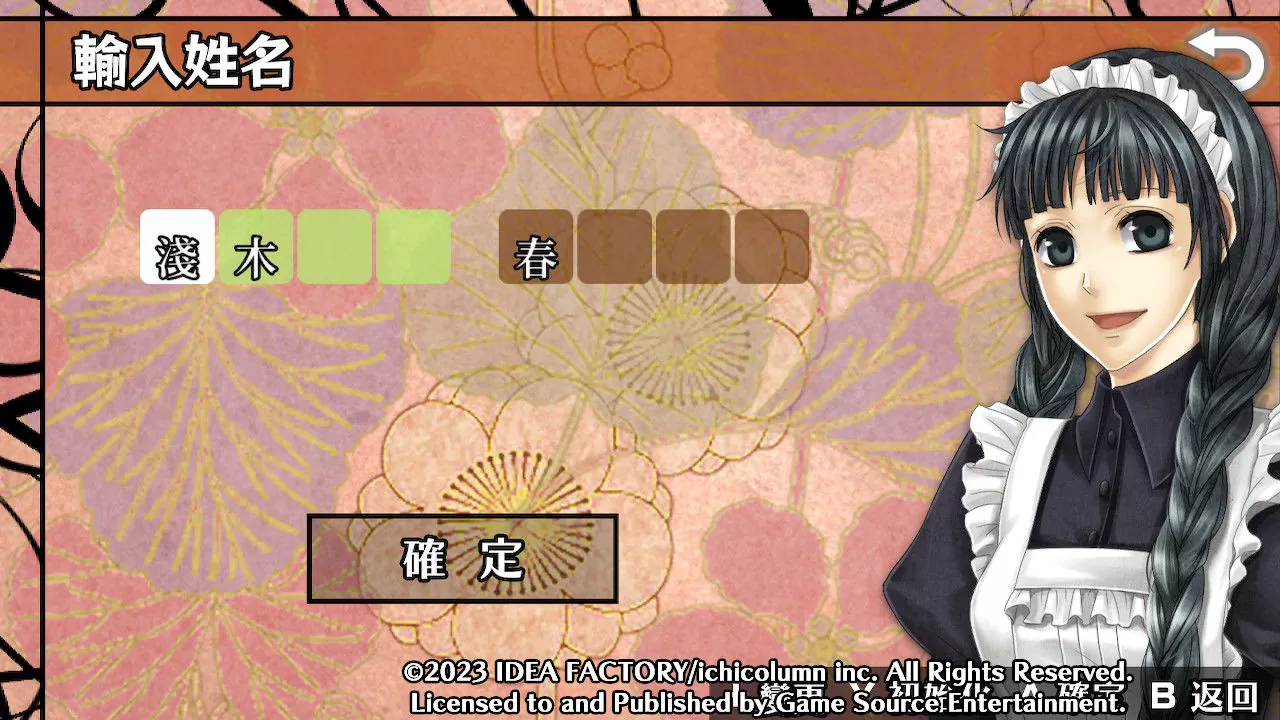 首先需要設置女主角的姓名。姓氏和名字分別可以設置4個字。系統默認名是「淺木 春」。如果使用默認名稱,遊戲角色將用語音稱呼女主角。