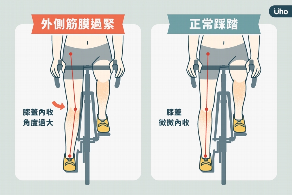 以膝蓋為例,正常騎車當腳往下踩時,膝蓋會有點微微向內收的情形,而當腳向上提時膝蓋又會有點微微向外打開的狀況,然而若大腿外側的筋膜過於緊繃,便容易導致內收的角度過大,膝關節外側的髂脛束與股骨外髁反覆地摩擦,進而產生發炎疼痛的狀況,即髂脛束症候群(iliotibial band syndrome)。