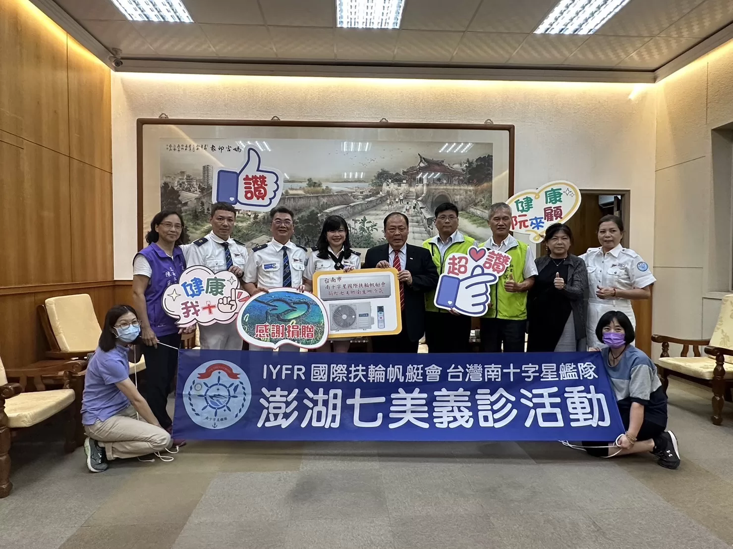 IYFR國際扶輪台南安平南十字星帆艇艦隊為改善七美離島居民就醫環境,由司令陳大偉、創隊司令邱詩涵及執行委員台南麻豆快樂診所王榮堂院長號召,副司令蔡明璋、預備司令胡台強、艇員莊邦琦等艇員響應,共同募集四台冷氣設備,並今〈22〉日下午3時在澎湖縣政府舉行捐贈儀式。