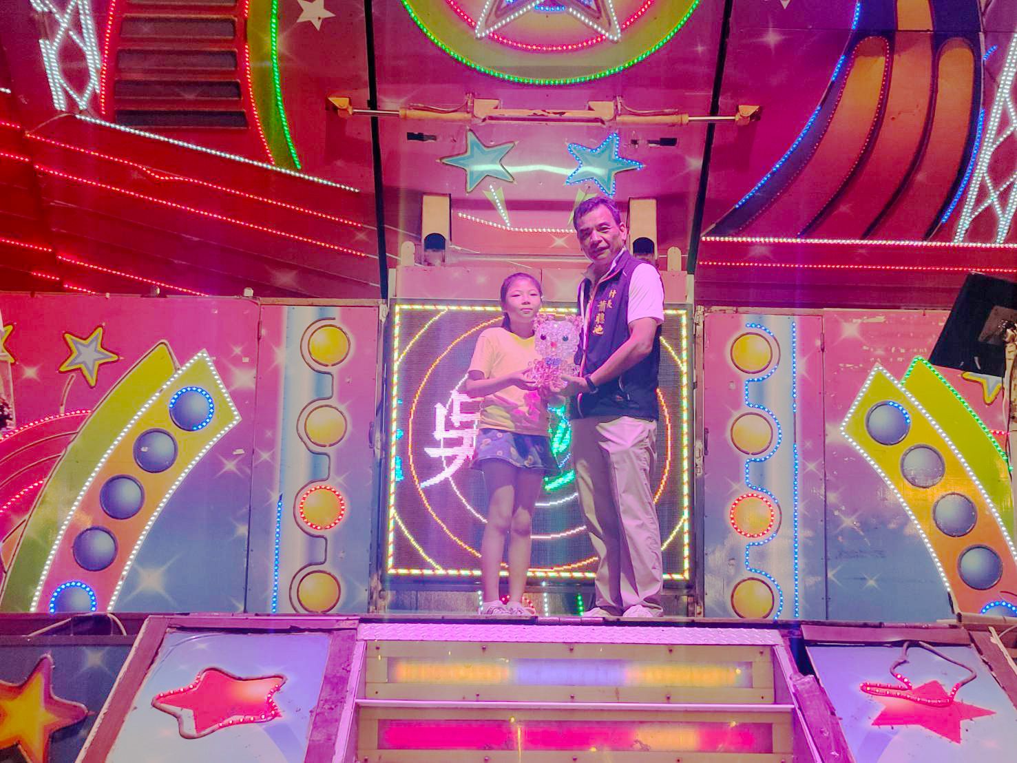 ▲蕭聰池代表抽出手工製作招財貓,象徵福氣滿滿、財源廣進,幸運者是一位小妹妹。(圖/張子宏攝)