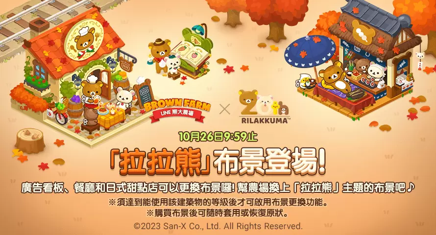 可改變農場建築物外觀的「拉拉熊」布景來囉!本次將推出廣告看板、餐廳與日式甜點店的特殊布景,限時登場的布景須達到能使用該商店的等級才可啟用,布景取得之後可以永久使用,也能隨時更換或恢復成原狀,快來幫農場換上「拉拉熊」主題的布景吧!