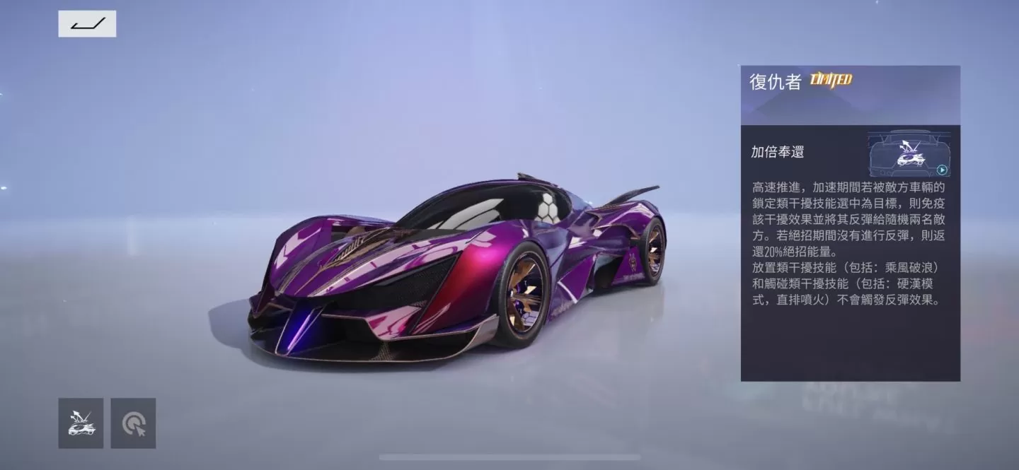 一、 幸運盲盒機:限定幹擾位車輛「復仇者」將於11月3日加入速度節。王牌絕招「雙倍奉還」可以限制敵方的速度,並反彈受到的干擾效果。