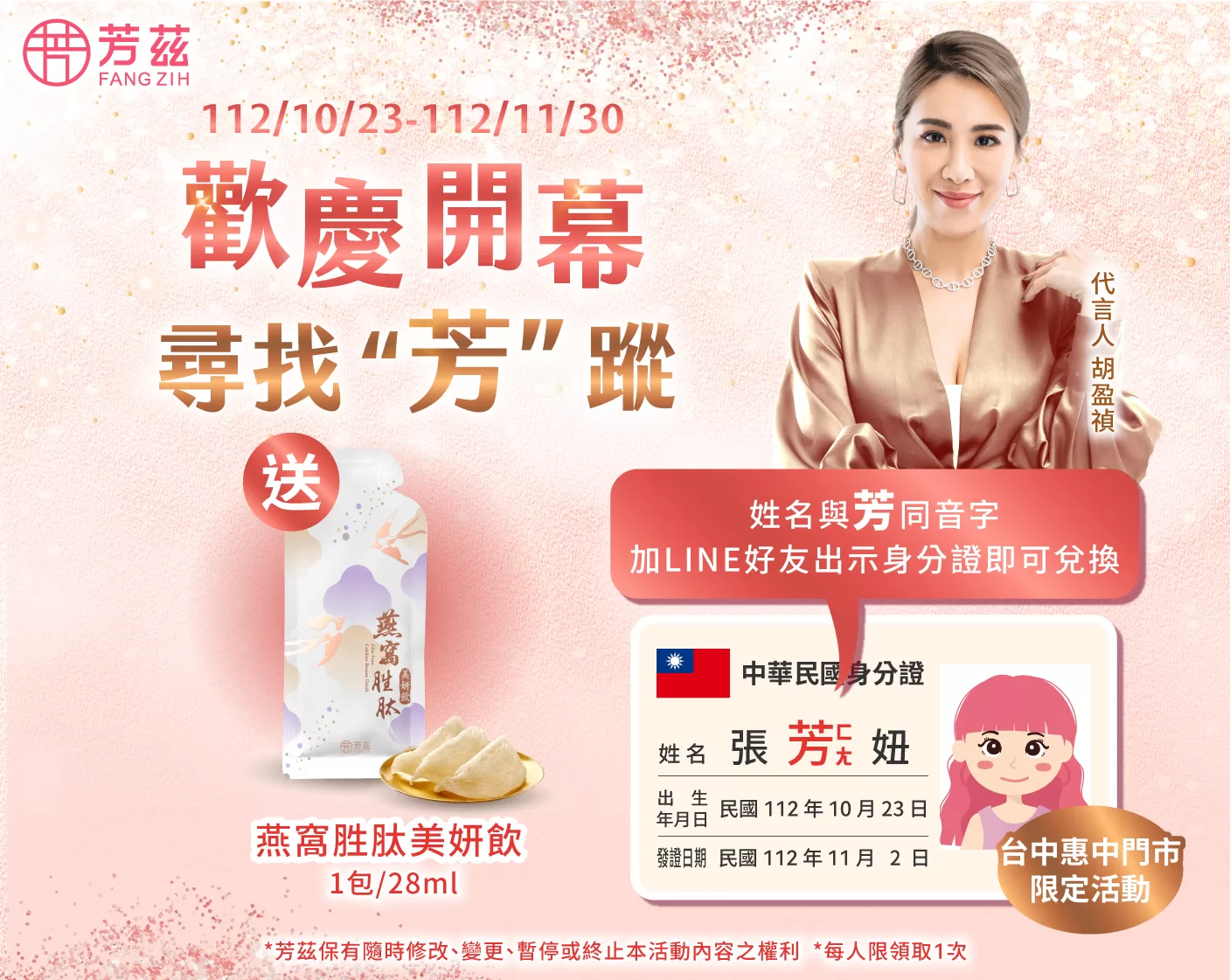 芳茲生技所推出的每一項產品,廣受市場的青睞與好評,靠的是將每位消費者都視作家人一般對待,這始終不變的初心。近期芳茲更榮獲金舶獎、癌症友善標章及媽媽寶寶推薦菁品等國內外殊榮認證,從滴雞精百大品牌中脫穎而出。為滿足民眾的需求芳茲前進中台灣展店,台中惠中門市於10月23日起試營運,即日起至11月30日舉辦「尋找芳蹤」門市開幕限定活動,以回饋長期支持芳茲的民眾,凡姓名內有「芳」或是同音的台中民眾,憑身分證領取即可領取「燕窩胜肽銀耳美妍飲」2入隨身組 (28ml / 包),只要在店內拍照打卡上傳,還能獲得精美來店禮, 數量有限送完為止!