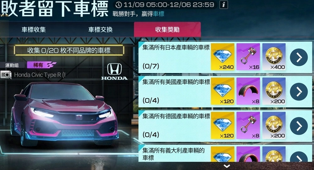 不僅如此,遊戲內同步開放全新賽道玩法,在「敗者留下車標」活動中,打敗對手,即可奪取他們的榮耀車標化為自身收藏,當車手們手握 20 枚不同車標,將可獲得 Honda Civic Type R ’19 豪車獎勵。