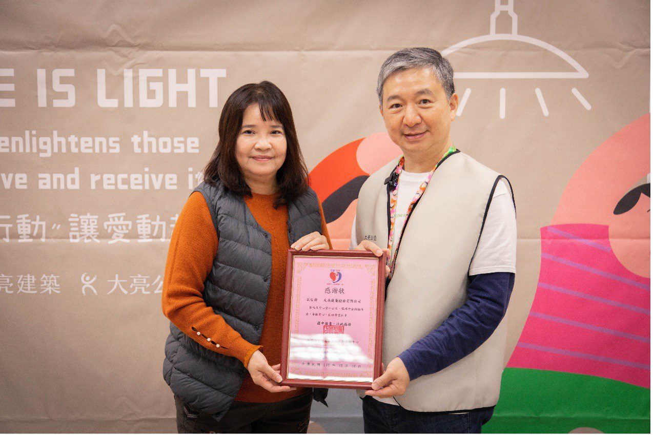 大亮建築提供機構所需的「多功能牽引復健機、防褥瘡氣墊床、洗澡便盆椅」作為捐贈,由長照中心負責人黃小姐代表接受並致贈感謝狀,黃小姐說到:「很開心有這個機會,希望你們明年、後年、大後年每年都來!」