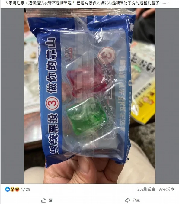 別吃!競選物發「洗衣球」13人當糖果誤食送醫!國民黨有候選人在彰化縣競選總部製作23萬包、46萬顆洗衣球作為家戶拜訪文宣品,但因洗衣膠囊字樣寫在包裝側邊、字體較小,傳出民眾因此疏忽誤食事件。胃腸肝膽科醫師示警,洗衣球內含界面活性劑,屬於強鹼,吃進腸胃裡會產生化學反應,恐導致灼傷、潰瘍、穿孔,嚴重更需進行食道或胃切除手術。