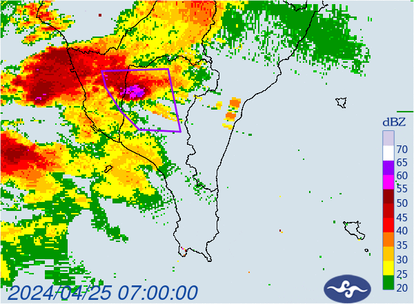 高屏地區民眾注意,113年4月25日7時7分氣象署發布大雷雨即時訊息,持續時間至8時0分;請慎防劇烈降雨、雷擊、9級以上強陣風,溪(河)水暴漲,低窪地區慎防淹水,以及低能見度。