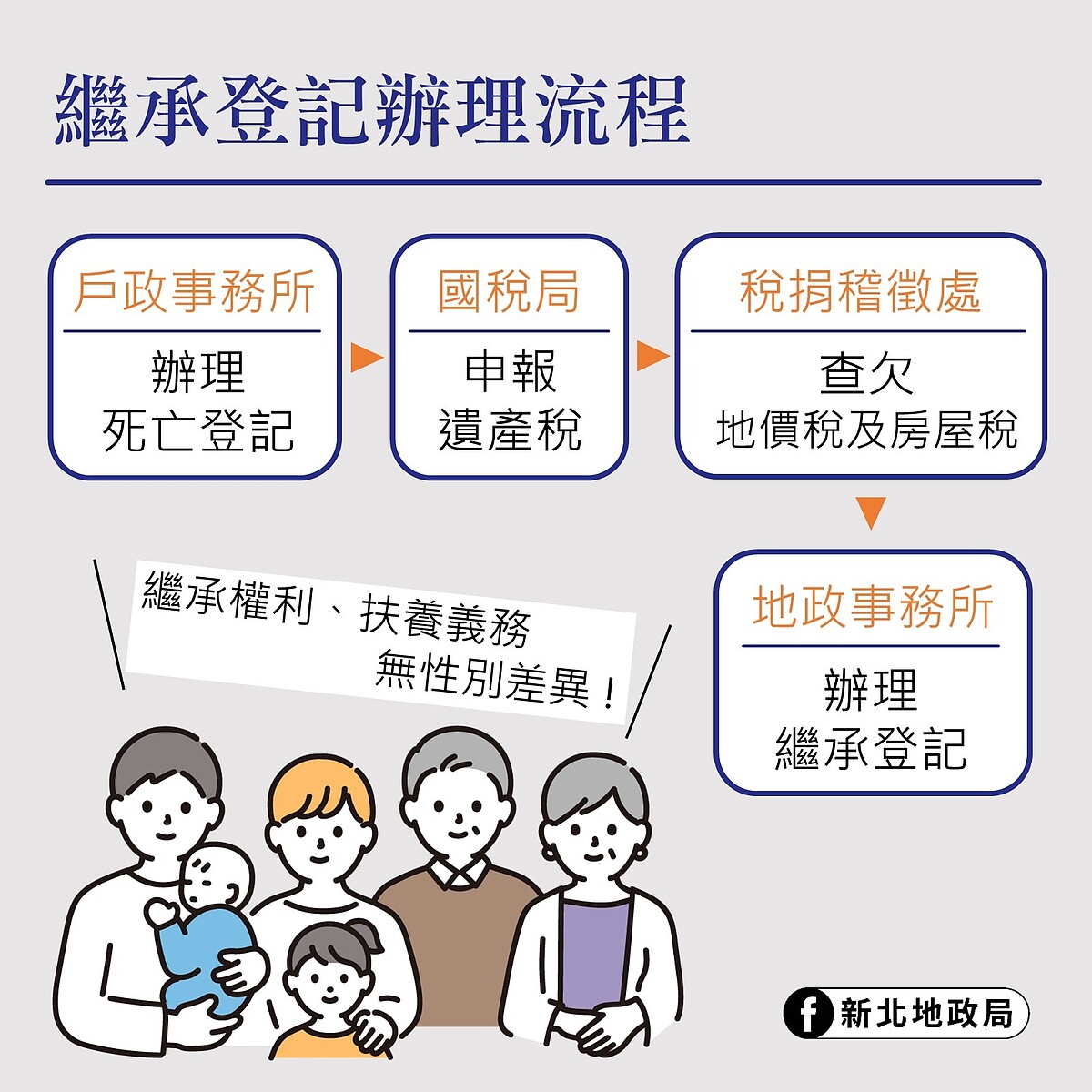 地政局表示,若想了解未辦繼承不動產資訊,可上新北不動產愛連網的「逾期未辦繼承土地列冊管理資料查詢」;如對申辦繼承登記有任何疑問,可洽新北市各地政事務所,或上地政局官網「業務專區」的「登記」項次下查詢相關申辦流程及應備文件。