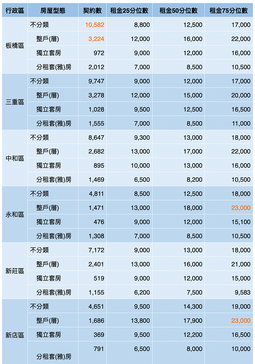 而代表家庭戶承租的整戶(層)比率,台北市為32.9%,新北市則高達54%。進一步觀察新北市整層住宅租金行情,若以極端租金75分位,觀察最貴租金,出現在林口區的2.5萬元,等於75%租約的租金,低於2.5萬元。