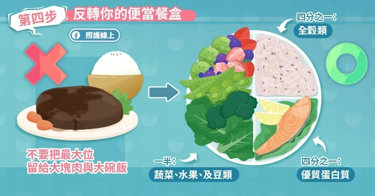 所以,這代表的是每次準備自己的一頓飯時,不要再把最大的位置留給一大塊的肉或是一大碗白飯。要把最大的位置留給蔬菜水果。如果你用盤子盛裝的話,大約是二分之一,也就是一半的盤子放著蔬菜、水果、及豆類。另外的一半,再分成一半裝五穀雜糧與一半裝優質蛋白質。如果真的要外食買便當,或是外食,也都可以用這樣的作法注意份量與比例,盛裝自己的一餐。