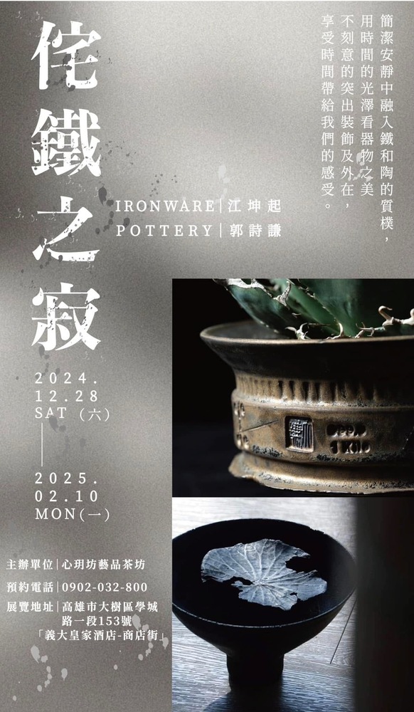 高雄市即將舉辦一場結合鐵與陶之美的藝術颯宴— 「侘鐵之寂」聯合展覽,由江坤起與郭詩謙藝術家藝術家聯手在高雄市大樹區學城路153號,義大皇家飯店商業街。心玥坊藝品茶坊展出
