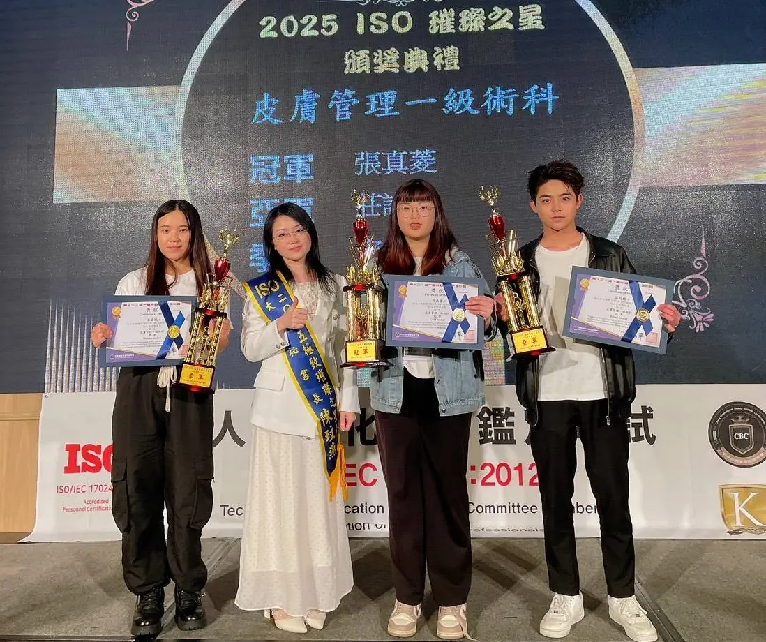 2025「ISO極致璀璨之星」 國際美業認證賽事,於3/27在台北新莊典華盛大登場,來自全國各地的學員與職人,參加美甲、紋繡、美髮及美業各項美學等競賽,歷經激烈競逐,DMB美業教育培訓中心成績優異,參賽學員頻頻斬獲佳績,共獲得5金5銀6銅等16獎項,是賽事活動中獲得獎項最多的團隊。其中就讀靜宜大學的張真菱更技冠群雄、連續拿下雙料冠軍。