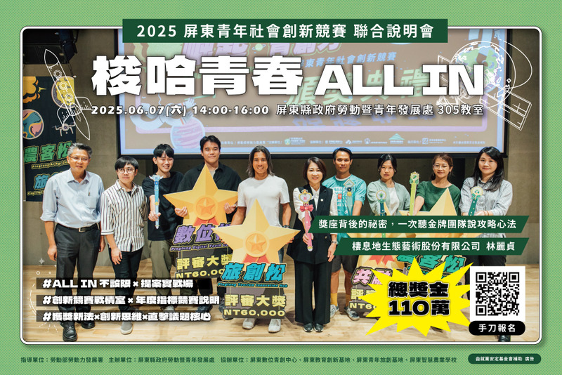 屏東縣政府向全臺敢拼敢創的年輕人喊話:「是時候展現真正的技術了!」2025年「梭哈青春ALL IN」青年社會創新競賽即日起開放報名,總獎金高達110萬元,還有機會獲得最高15萬元的實作補助金。這場專為18至45歲熱血青年打造的創意擂臺,將聚焦「數位科技」、「創新旅遊」、「智慧農業」及「教育創新」四大領域,邀請各路好手用創新思維為屏東注入新活力。