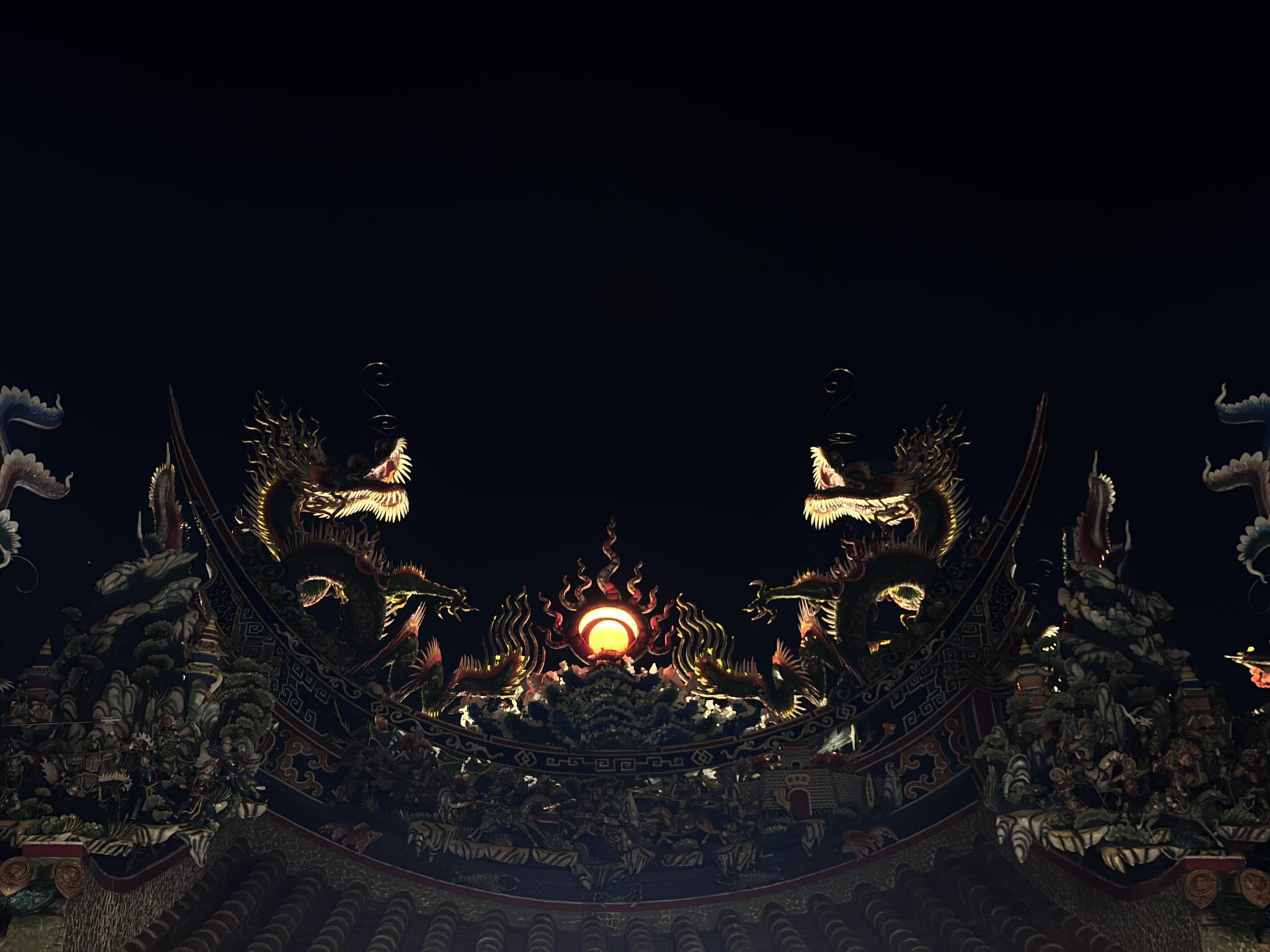 杜聖聰感性的說,三尊觀世音菩薩端坐正殿中,默默注視屋頂的雙龍吐珠。菩薩是信仰的中心,龍珠是信仰向外伸展的星光。白天無數香客膜拜,夜晚的雙龍吐珠卻給予更深的回聲:信徒的心願、匠人的堅持、地方的記憶都在夜裡無聲凝聚。