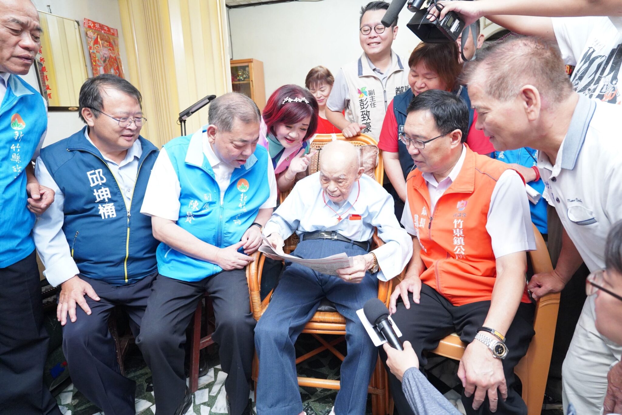 九九重陽節即將到來,新竹縣副縣長陳見賢今(20)日上午偕同社會處同仁,帶著祝賀禮金、敬老狀、總統府長者敬老金箔狀、衛福部金鎖片,走訪居住在竹東鎮的8位百歲人瑞。陳副縣長說,楊文科縣長疼惜長輩,除了持續發放敬老津貼、今年首次以一萬元祝賀禮金替代過去送毛毯等禮物,百歲公百歲婆開心不已。