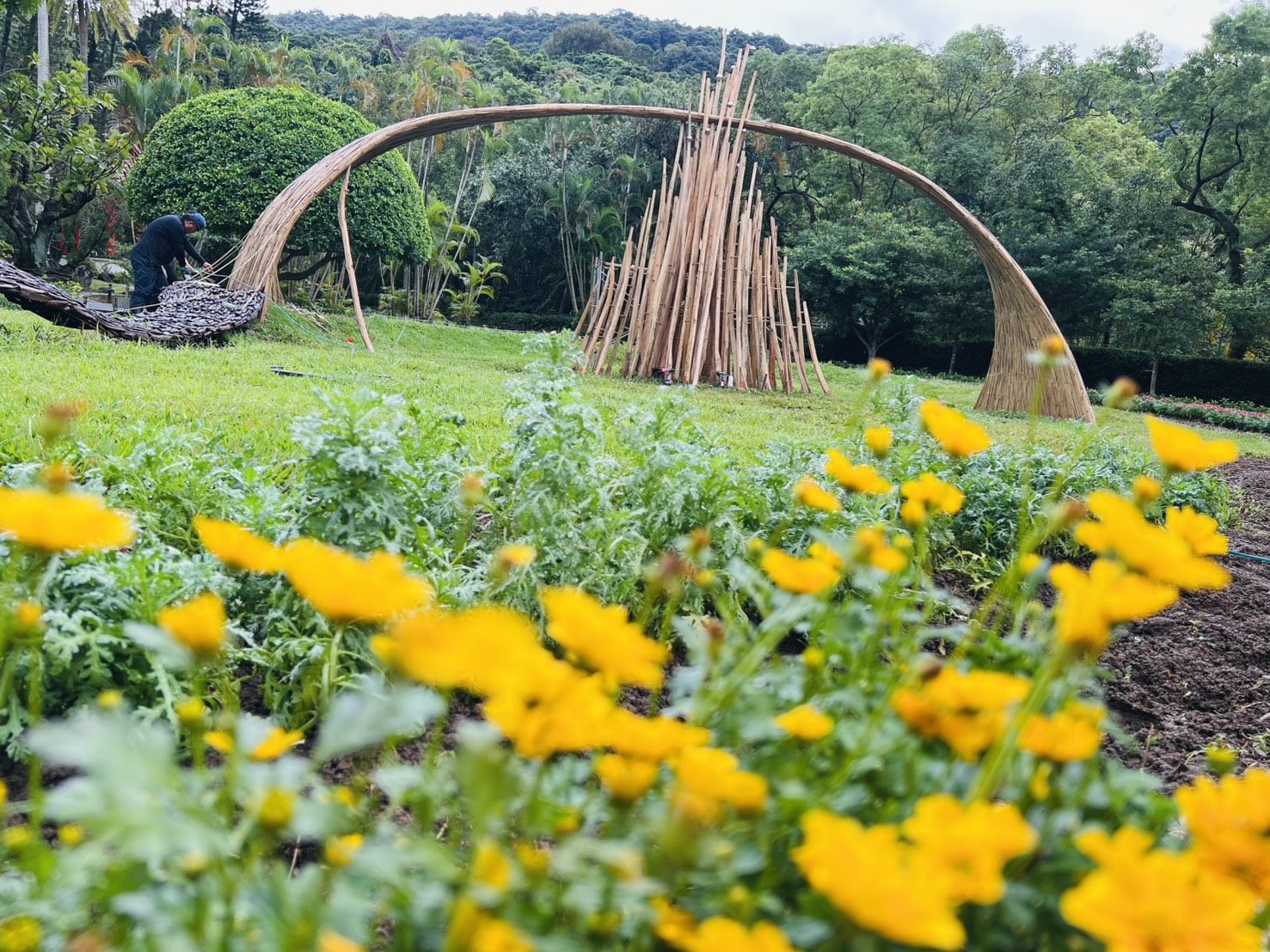 公園處藍舒凢處長表示,士林官邸菊展近年積極與各領域藝術家合作,創作出具識別度的特色作品。今年延續跨界精神,邀請多組藝術家共同打造大型裝置,以地景創作結合花卉展演,營造宛若置身畫境般的沉浸式體驗。在主題園區的「夢想逐路探尋」展區,花東地景藝術家撒部.噶照帶來大型新作「風起光湧」,以原木、竹材結合風的律動與光的穿透,打造會「發光、發聲」的地景藝術。作品更使用臺北風倒木再生創作,與花海如浪交織,呈現逐夢旅程的韌性與希望。在中式庭園「幸福.憩家園」展區與藝術家小亨利共同創作竹構裝置「流光之巢」,竹材交織成溫暖穹頂,陽光從縫隙灑落,如鳥巢般象徵「夢想的起點」,周邊藤球、斗笠與菊科草花營造恬靜氛圍,讓人沉浸在緩慢舒心的鄉野氣息。
