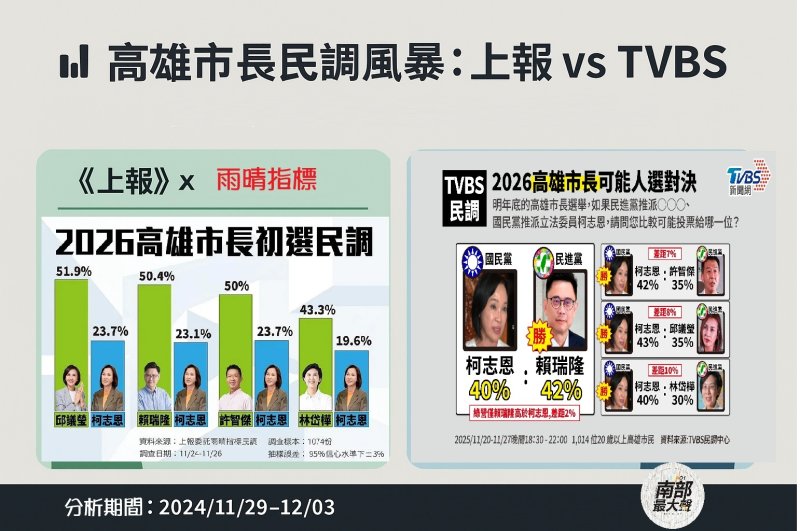 短短幾天內,高雄選民被兩種截然不同的圖像轟炸:一邊是《上報》版的「綠營全面大勝 20%」、一邊是 TVBS 版的「藍綠勢均力敵甚至藍營領先」。多數關心選情的人心裡都浮現同一個問號——究竟是哪一份比較接近真實?還是說,這兩份民調本身就各自帶著不同的政治用途?