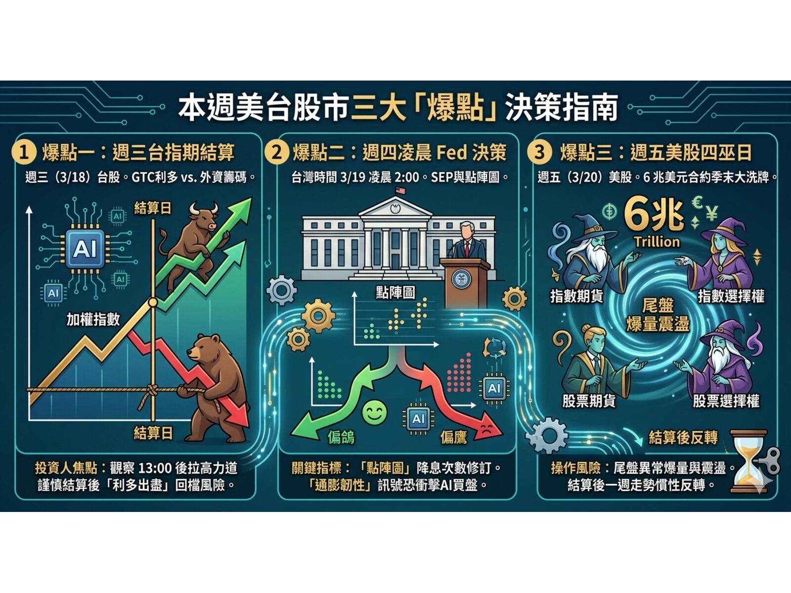 2026 年 3 月第 3 週,全球資本市場迎來上半年最關鍵的「動能轉折點」。隨着 NVIDIA GTC 大會揭開 AI 新架構序幕,本週市場將接連遭遇台指期結算、聯準會(Fed)利率決策以及美股「四巫日」三大重磅事件洗禮。分析師提醒,本週市場波動率(VIX)預計將顯著放大,投資人應緊盯「點陣圖」指引與季末籌碼換手動向。