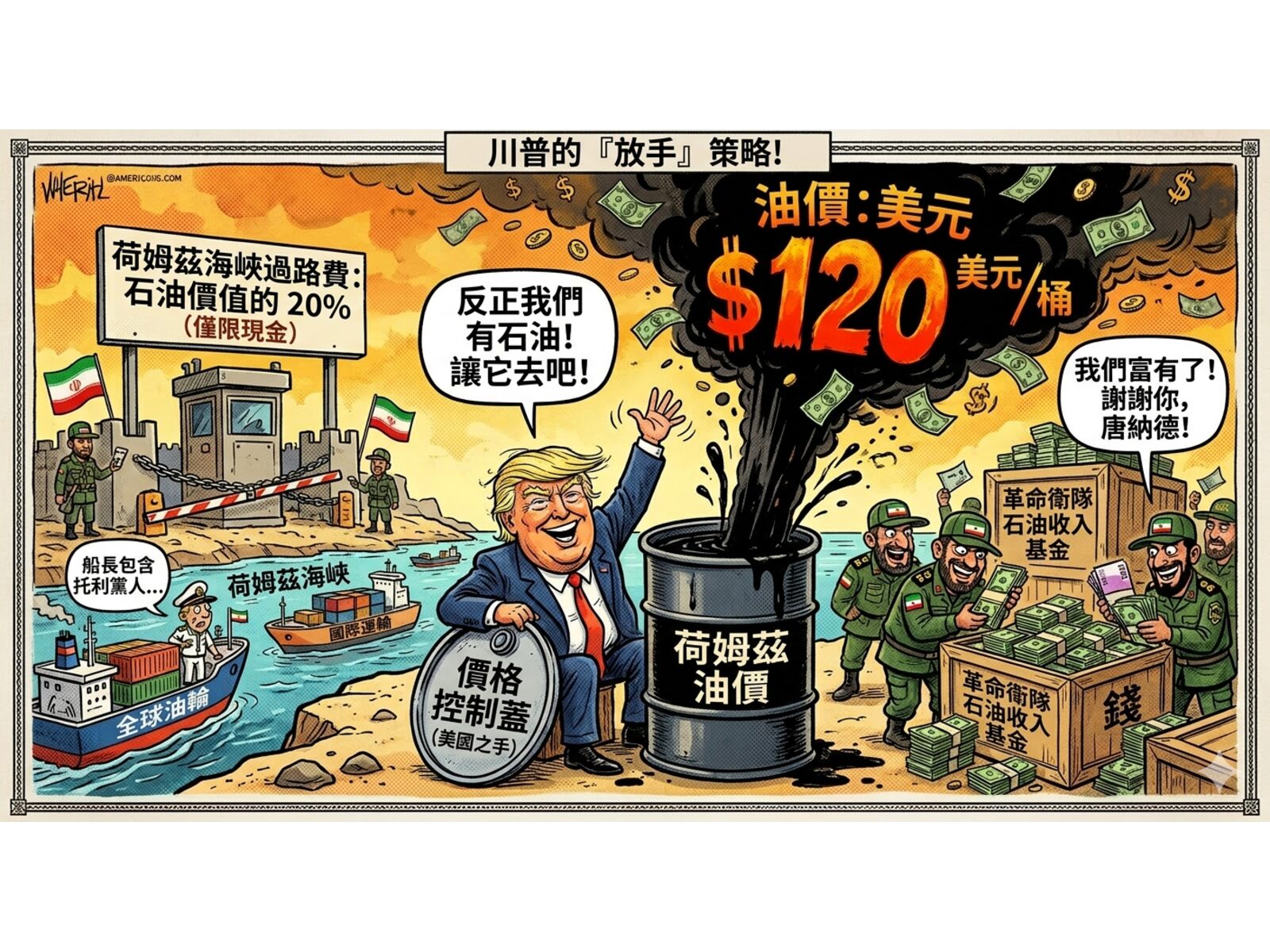 川普指出,荷姆茲海峽是全球最重要的能源航道之一,承載著全球約五分之一的石油運輸,但受益者多為法國、英國、日本、南韓及中國等經濟體,而非僅限美國。他批評這些國家多年來「搭便車」,享受美軍提供的安全保障,卻在要求共同維護海上航道安全時反應消極。