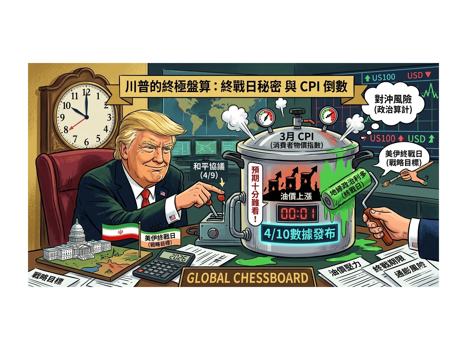 隨著中東戰火延燒,全球金融市場正屏息以待下個月的關鍵時刻。華府政壇近日傳出,川普政府已將 2026年4月9日 訂為「美伊終戰」的戰略目標日。然而,這項看似突如其來的和平協議,背後隱藏著極為冷酷的金融算計:為了對沖即將在 4月10日公布、預期將慘不忍睹的 3月份消費者物價指數(CPI)數據。