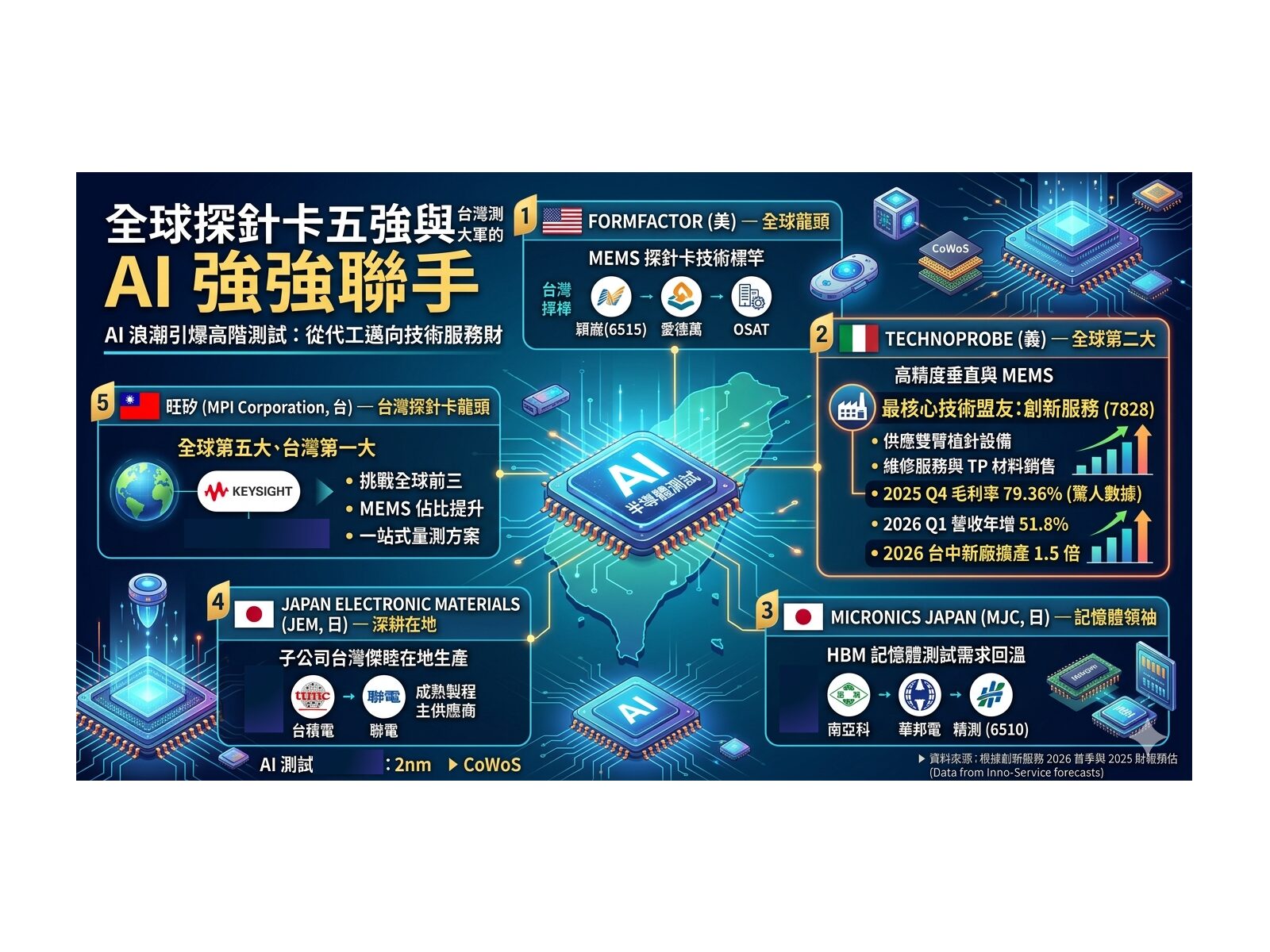 從 2026 年第一季的表現來看,台灣廠商已成功從「價格戰」轉向「技術服務財」。以創新服務 (7828) 為例,其之所以能維持近八成的毛利率,主因在於掌握了探針卡中最精密、成本最高的「維修與自動化植針」環節。
