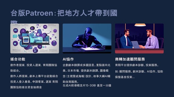 在全球影視市場競爭日益激烈的背景下,AWC導入AI技術協助創作者進行提案優化。平台可將劇本長綱轉換為標準化提案格式,並自動生成英、日、韓文版本,協助創作者快速進入國際市場。