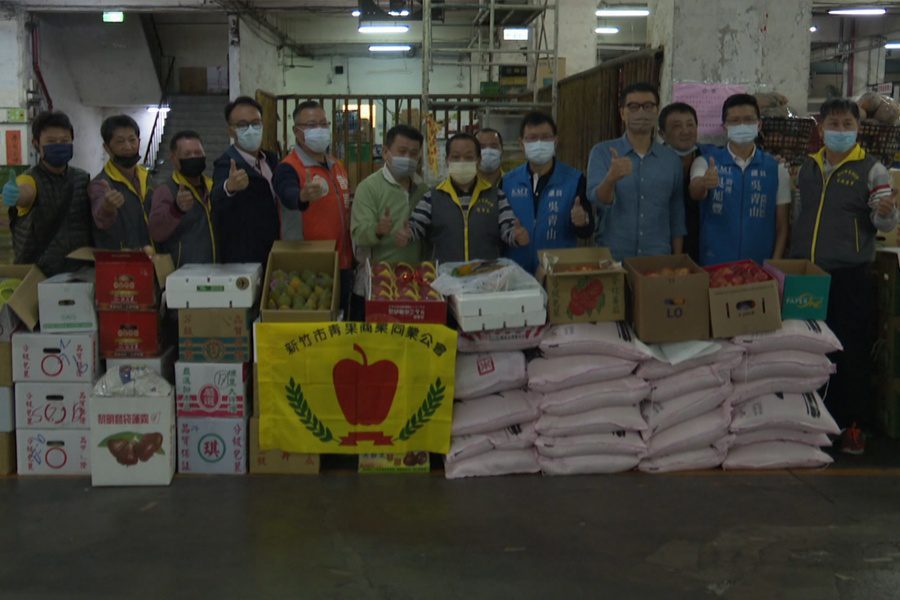 一箱一箱的新鮮蔬果及白米整齊堆放在一起,新竹市青果公會寒冬送暖活動邁入第22年,今年,雖然受到疫情的影響,生意沒有往年好,但是攤商們仍舊準備了澎湃的物資,要贈送給弱勢單位。