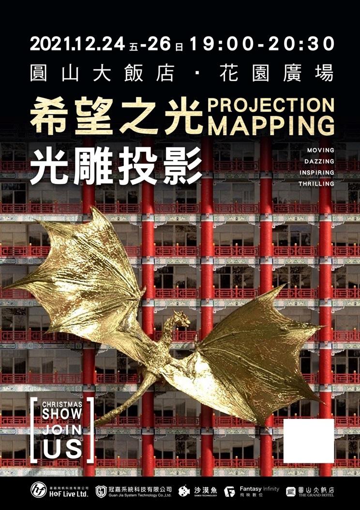 圓山大飯店將於12月24日至26日三天晚上7點至8點30分,舉辦《希望之光Light of Hope》光雕秀,這不僅是圓山首次,更是星級飯店首度舉辦大型戶外光雕秀。圓山大飯店自從以客房設計呈現「ZERO」、「平安」、「加油」點燈後,從著名的建築地標成為傳達愛與關懷的重要指標,為呈現圓山建築的多元風貌,今年特別與「豪器飛帆集團」合作,以圓山東方建築結合聖誕西方節慶的特色,推出《希望之光Light of Hope》光雕秀,透過希望之光的投影,祈祝大家平安健康。