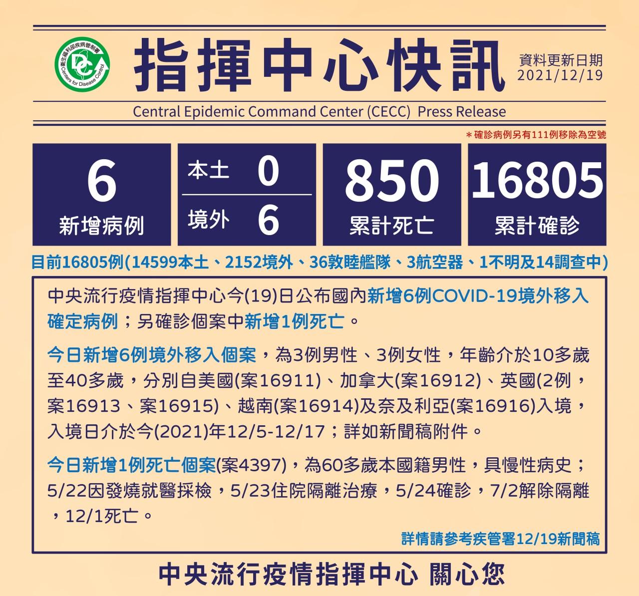 國內COVID-19確診,19日新增6例境外移入,全部都是本國籍,其中5人突破性感染,3人為無症狀感染者。另無本土確診,但新增1例死亡。