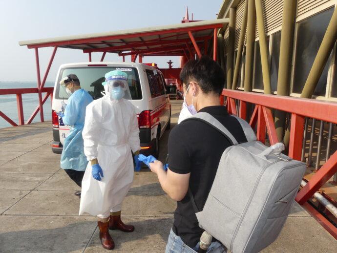 為完善小三通復航之旅客通關及防疫作業,縣府今天下午3時30分舉行的小三通復航演練,由縣府觀光處邀集水頭碼頭CIQS各單位參與沙盤推演。演練流程從旅客自小三通船舶下船後,依循防疫動線指示,出示入境檢疫系統畫面、二日內核酸檢測陰性證明與護照,接著至採檢區,進行咽喉唾液取樣與體溫量測,領取快篩試劑後,依正常通關程序入境,並依指示搭乘指定防疫車輛至防疫旅館進行為期10日之居家檢疫。演練過程由30名工作人員充當入境旅客,並安排一輛防疫巴士,演練完善逼真。同時,縣府觀光處擬定防疫腳本,因應旅客可能發生的各項突發狀況: