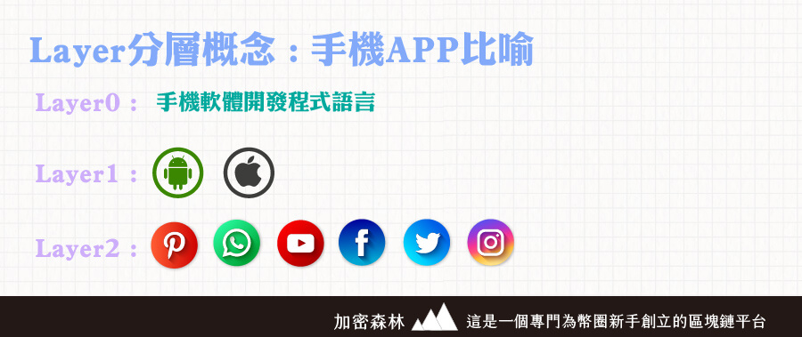 拿手機APP比喻,僅作為更好理解Layer分層概念的形容而已,區塊鏈技術跟發展都還處於非常早期,實際上Layer分層目前多數的區塊鏈商品都仍停留在Layer 第一層。
