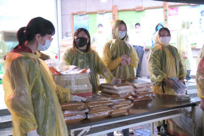 ▲豐濱鄉端節生活物資發放現場,工作人員穿雨衣作業,辛苦認真。(圖∕縣政府提供)