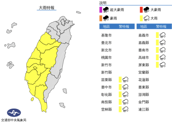 大雨特報地區:苗栗縣、台中市、彰化縣、南投縣、雲林縣、嘉義市、嘉義縣、台南市、高雄市、屏東縣