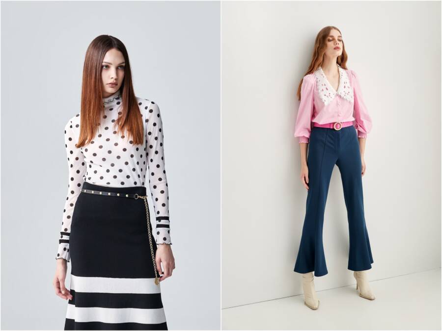 ▲(左)點點印花內搭式上衣1,380元;(右)復古風全長喇叭褲。(圖/iROO提供)
