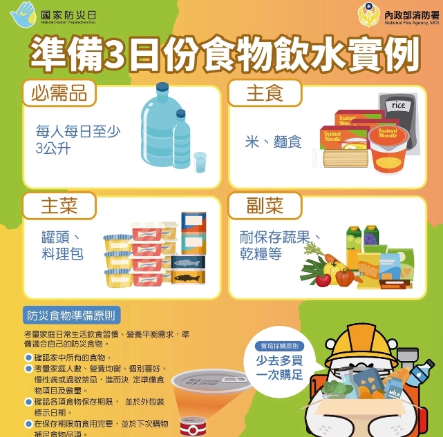 民眾應該有充裕的防災準備,消防署防災圖卡也說明,準備3日份的食物飲水,以因應無法預期的地震災害。